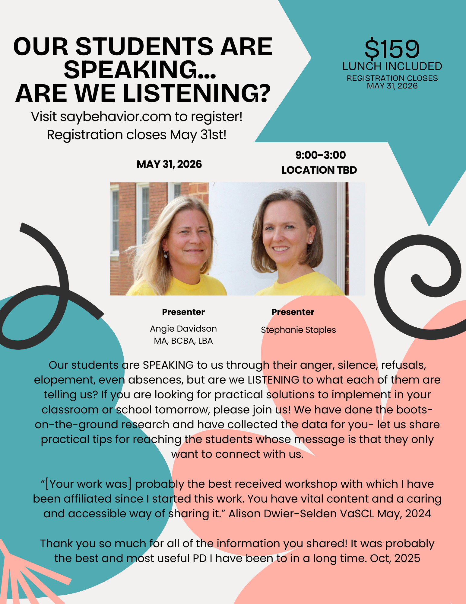 Our students are SPEAKING to us through their anger, silence, refusals, elopement, even absences, but are we LISTENING to what each of them are telling us? If you are looking for practical solutions to implement in your classroom or school tomorrow, please join us! We have done the boots-on-the-ground research and have collected the data for you- let us share practical tips for reaching the students whose message is that they only want to connect with us.